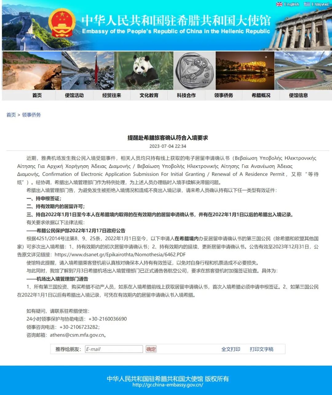 针对此事,中国驻希腊大使馆网站7月4日发文,提醒赴希腊旅客确认符合入境要求。