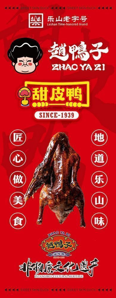 赵鸭子创始于1939年,历经85年历史,历时三代传承,2022年赵鸭子甜皮鸭获得“乐山市非物质文化遗产技艺”和“四川省天府名店”荣誉。如今赵鸭子各门店已经成为乐山城区著名的美食打卡点。日接待数千名中外游客。拥有连锁门店100余家。