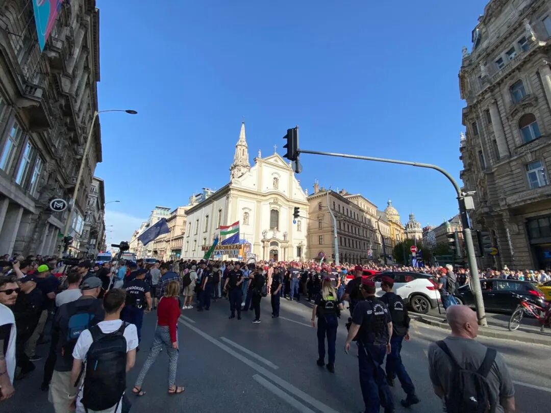 周二下午5点,费伦切克广场上挤满了示威者。警察在街道两旁站岗,确保自由广场(Szabad SajtóRoad)的交通畅通无阻。广场戒备森严,抗议者被禁止上街。人们高呼口号“集会是一项基本权利”,“肮脏的青民盟”……