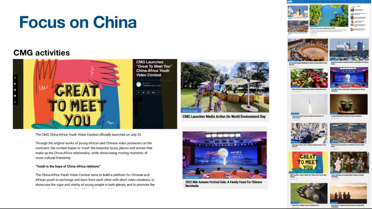 报告指出,过去一年间,总台通过聚焦非洲议题、中国及中非合作议题、国际议题三大主要新闻集群,呈现出以诠释非洲发展为主,突出中非合作发展要闻,兼顾解读重大国际事件的内容制播导向。聚焦非洲发展变化,向世界讲述多元非洲;聚焦中非合作发展大事,向非洲讲述精彩中国;立足中国国际立场,解读重大国际事件。