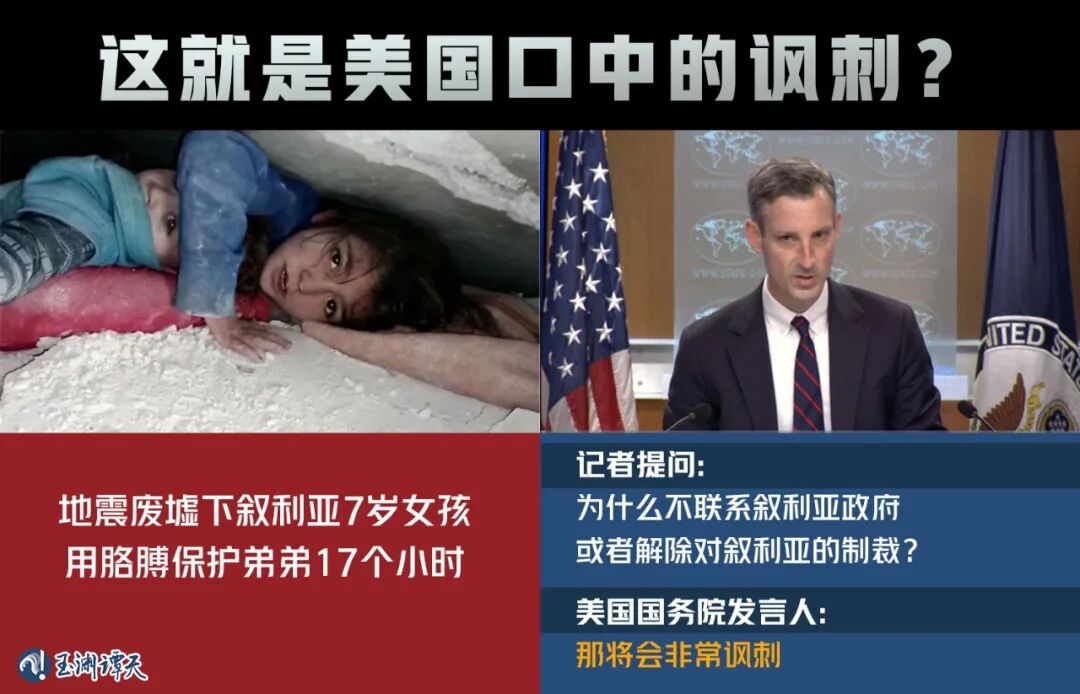 然而,在美国国务院的新闻发布会上,新闻发言人面对美国制裁阻碍对叙利亚人道主义援助的质疑,只用了两个字,“讽刺”。