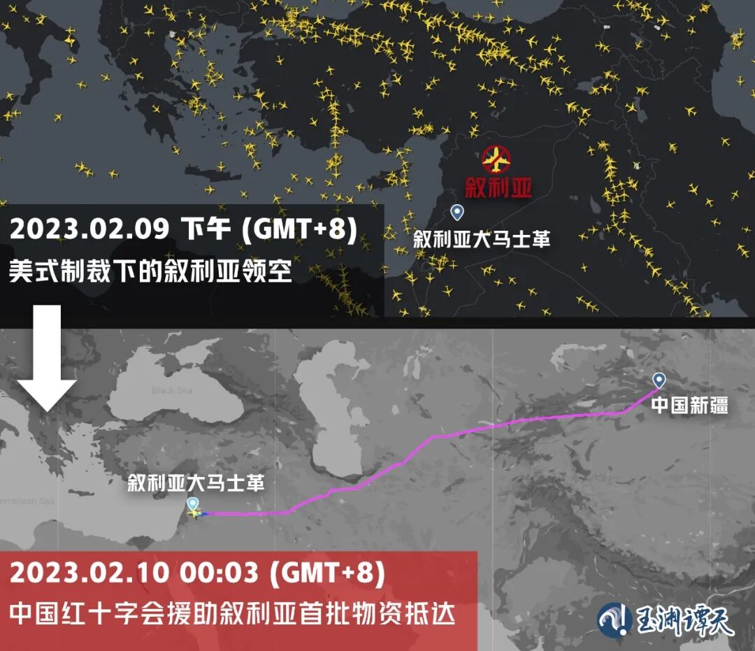美国战机在空中耀武扬威的同时,约1万公里外的叙利亚震区上方仿佛是真空区域,来往的飞机纷纷绕开,略过叙利亚空域。由于美国制裁,叙利亚的救援被极大延误,生命窗口期正在缩小。当然,美国还是有自己的说辞——为了它眼中的“人道主义”。