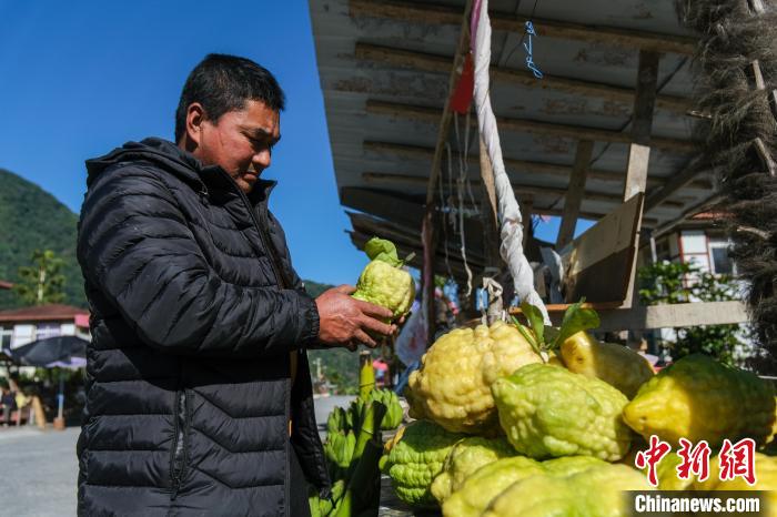 12月19日,48岁的门巴族次仁旺加在家门口马路边码放大柠檬,这些墨脱特产主要向路过的游客销售。中新社记者江飞波摄