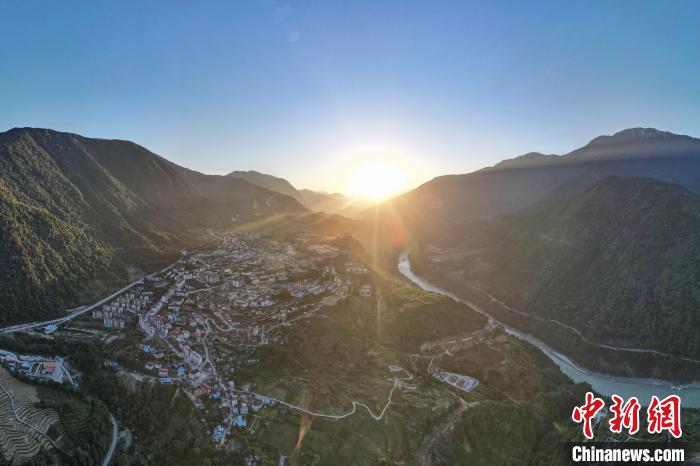图为12月19日傍晚,西藏林芝市墨脱县城日落风光,画面右侧为雅鲁藏布江。(无人机画面)中新社记者江飞波摄