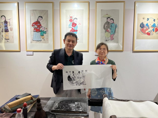 韩国新华报社长曹明权体验木版年画拓印制作。(刘强摄)