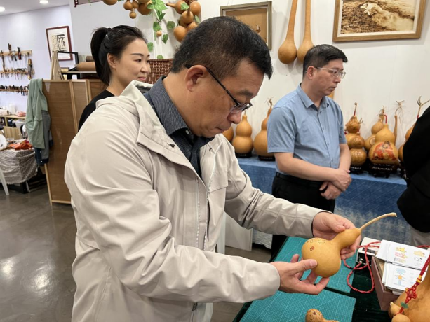 日本Trip7控股集团董事长郑继飞观摩葫芦烙画。(刘强摄)