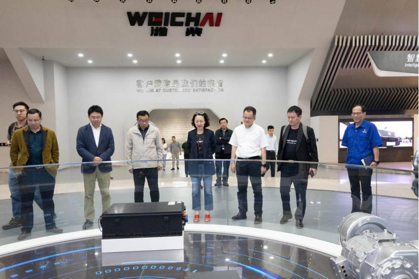潍柴集团党委书记、董事长、总经理马常海(右三)陪同华媒一行参观潍柴动力。(潍柴动力供图)