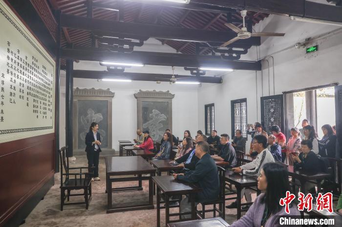 图为海外华文媒体人士在白鹿洞书院内聆听讲解员介绍《白鹿洞书院揭示》(即《白鹿洞书院学规》)。中新社记者刘力鑫摄