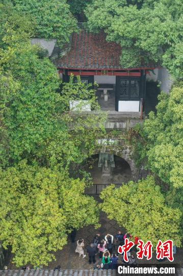 图为海外华文媒体人士在白鹿洞书院参访。(无人机照片)中新社记者刘力鑫摄
