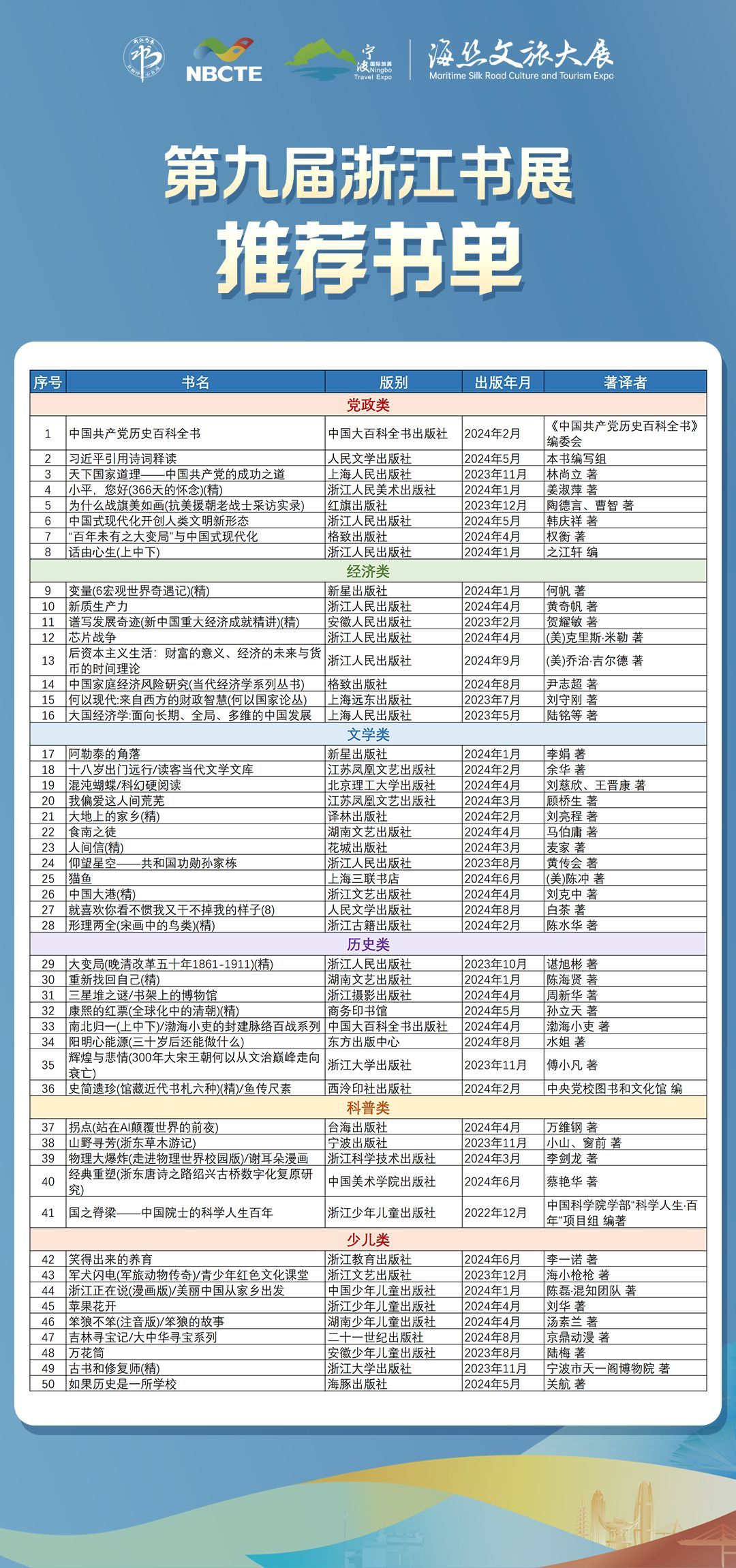 活动现场发布了“浙江书展年度推荐书单”,书单涵盖了党政、经济、文学、历史、科普、少儿6大类、50种推荐书目。