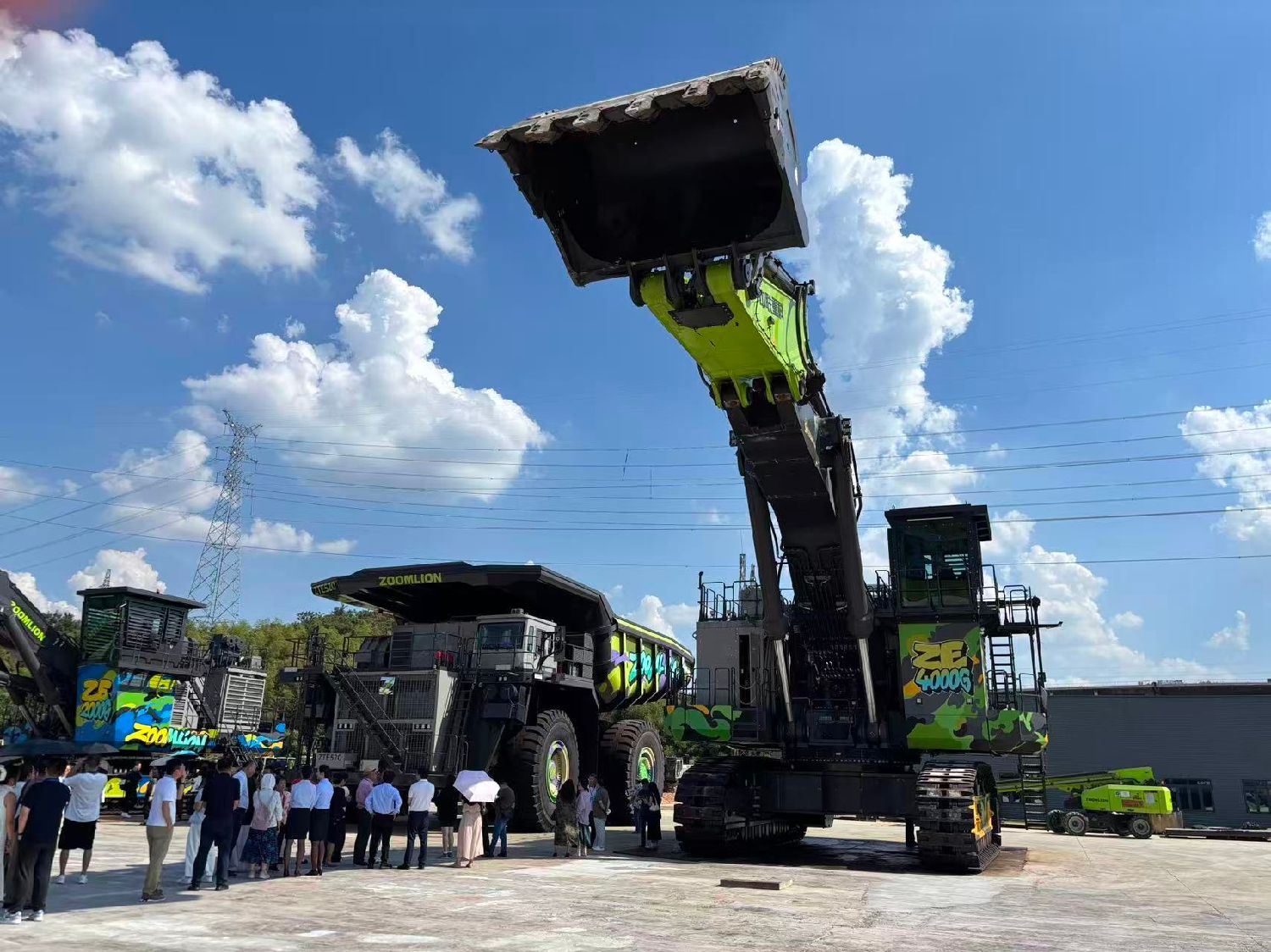 在现场,采访团的记者们被两台“巨无霸”——全球领先的400吨级超大型矿用液压挖掘机、全球最大混合动力矿卡300吨级混合动力矿用卡车所吸引。
