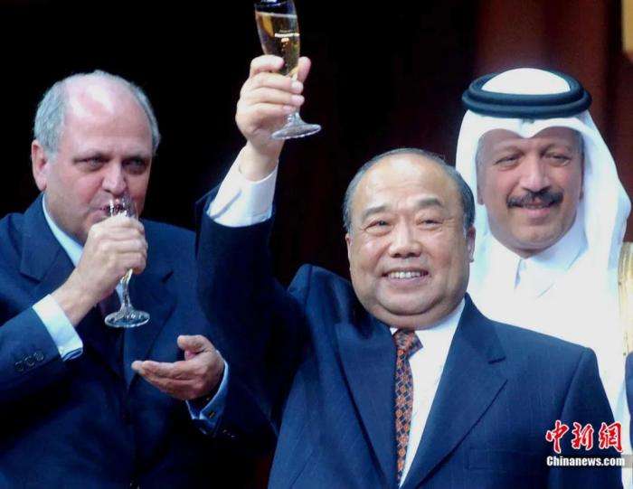 On November12,2001,the signing ceremony for the China’s accession to the WTO Protocol was held in Doha,the capital of Qatar.At the signing ceremony,thenChineseMinister of Foreign Trade and Economic Cooperation Shi Guangsheng,along with representatives from various countries,raised their glasses to celebrate. (CNS)